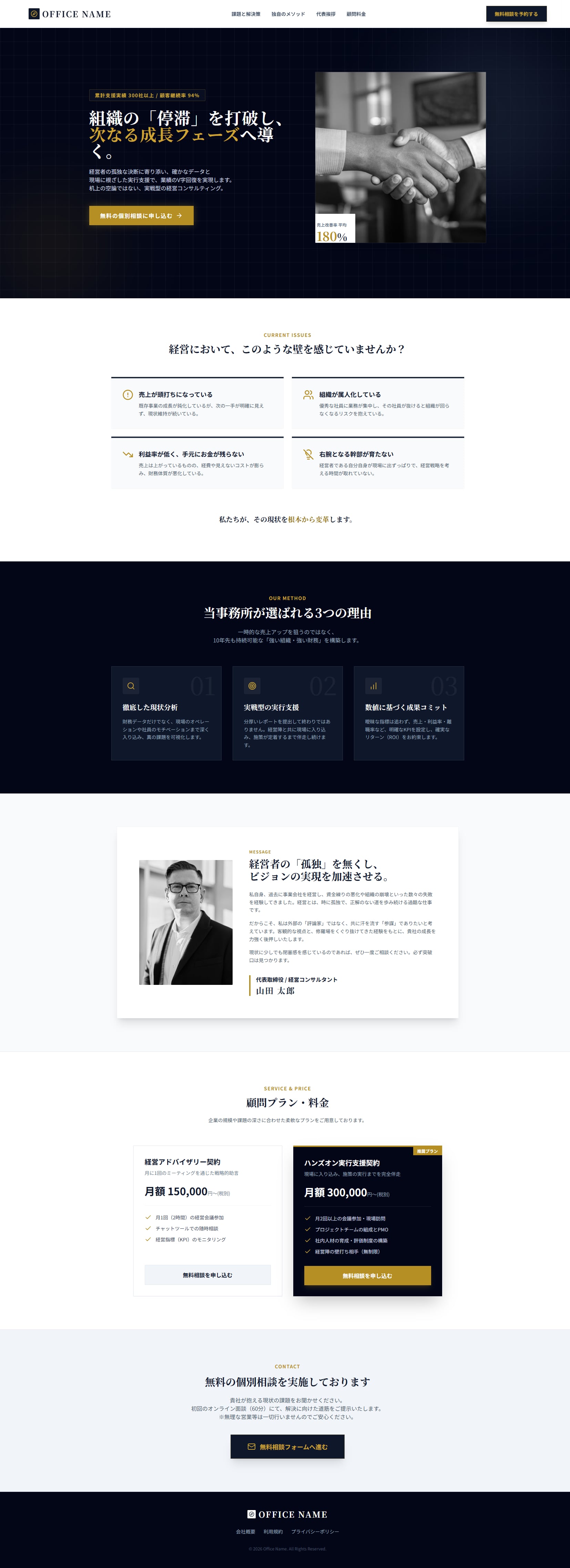 圧倒的な「権威性」と「高級感」を演出するネイビー&ゴールドを基調とし、あなたの専門知識を高く売るための王道セールス構造を採用しています。